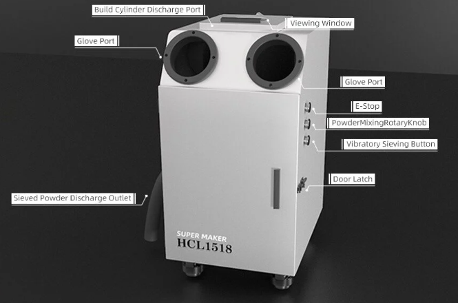 Полностью закрытая система пост-обработки SLS 1518. Эта комплексная система объединяет очистку, просеивание и смешивание порошков, обеспечивая управление одним нажатием кнопки.